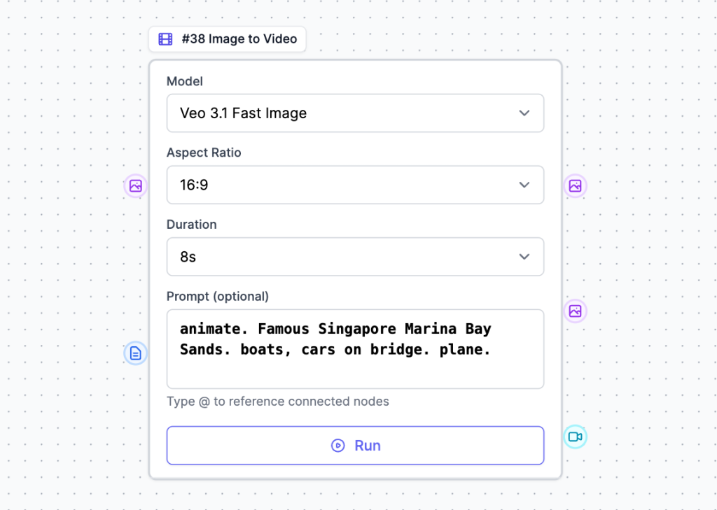 - Model: Veo 3.1 Fast Image or Veo 3.1 Image (consumes more credits)